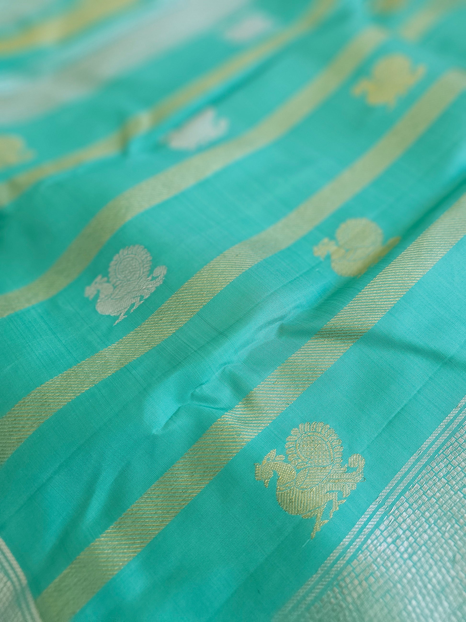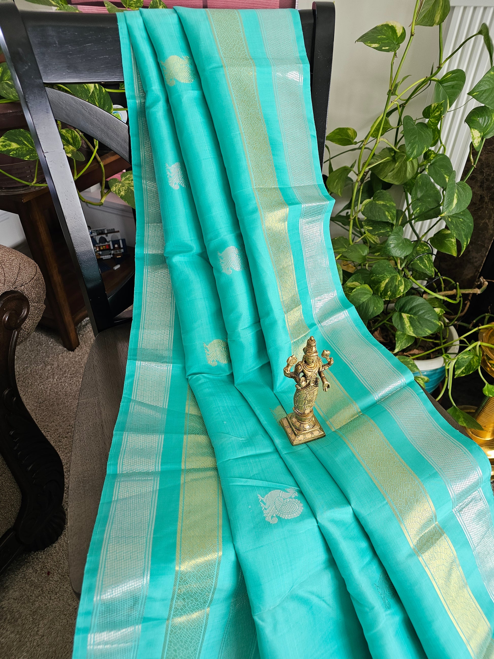 Teal with silver and gold motifs all over the saree